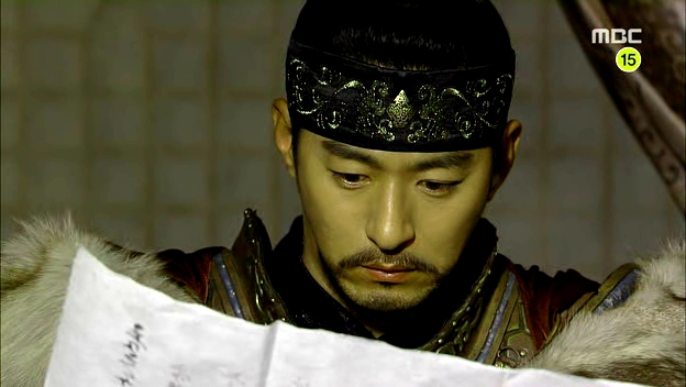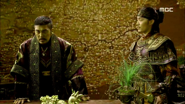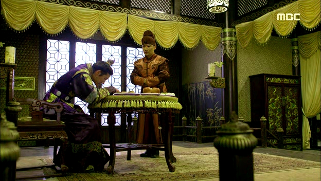 Ta-hwan was troubled with the award list, pondering over it by himself. He wondered where Seung-nyang had went when she arrived at his quarters and showed her the list which he made himself (and his head was about to burst from working on it! Hehehehe). I can only understand Baek Ahn’s name there, listed as the Chancellor, but Seung-nyang thought that they had to give the highest position to Lord Oh and the governors to keep them on their side. Ta-hwan was also thinking the same thing but it was impossible to put all of them on the same position as Baek Ahn. Seung-nyang had an idea and she reshuffled the list. Ta-hwan praised her idea and told Seung-nyang that the person who deserved a reward the most was not on the list; that person was not Baek Ahn or the governors, but Seung-nyang herself, who paved the way for Ta-hwan to become a respected Emperor. He assured her that he would give her a big reward afterwards.