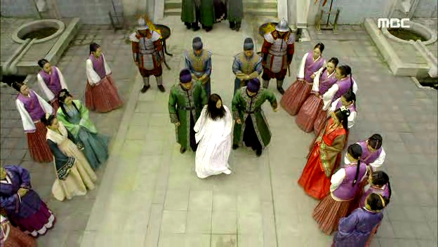 It must be the execution day, because Tanashiri was waiting nervously in the Cold Palace before the eunuchs (led by a scary looking Dok-man) arrived to drag her out. Court Lady Seo and Yeon-hwa could only look at her helplessly as she was brought to the palace compound. The Imperial Concubines were smirking at her and the maids had the disgusted look in their eyes. Tanashiri, being a girl full of pride she was, challenged them to keep jeering at her. The poison was brought to her, but she threw it on the floor, demanding to see Ta-hwan.