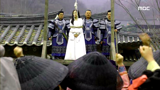 The citizens were gathered outside the palace to witness the public execution and Dangkise was also there, together with Byung-soo and Jo-cham. Dangkise was about to lose himself when Tanashiri wass dragged out, but Byung-soo warned him that they would die if he couldn’t control himself. The public was shouting for Yeon-chul’s daughter to be killed, while Dangkise could only look at his pitiful sister from afar.