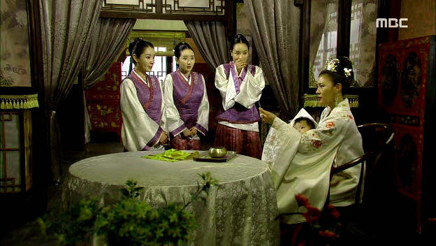 Seung-nyang received the news of Ta-hwan visiting Bayan and her face fell. Was she waiting for him? She looked at the sleeping Ayu in her arms and recalled the time when Ta-hwan came over to play with Ayu. He cooed at his son and Seung-nyang told him jokingly to stop teasing their son, afraid that the baby would get upset. Ta-hwan was jealous of her attention towards Ayu and stated that he’s more upset. Awwwwwww! He then asked Seung-nyang the million dollar question – who’s more precious to her: Ayu or him? She was brilliant to avoid answering the question by asking him back – who’s more precious to him: Ayu or him? Hehehe! Ta-hwan and Ayu looked at each other and the father only grinned at his son. He put Ayu on the bed and sat in front of Seung-nyang.