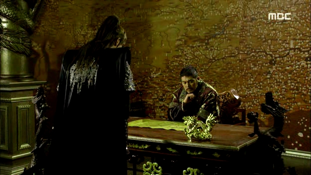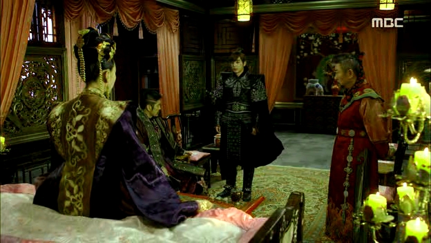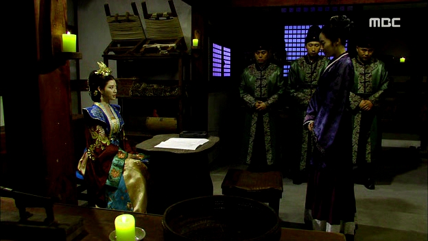 The officials and ministers were waiting for someone in the temple and it was no other than Seung-nyang, who called them to ask for their help since the Dowager and the Chancellor were using this chance to kick her out of the palace. Unfortunately, they didn’t want to get involved with the Goryeo King since it would mean big trouble for them and they persuaded her to abandon Yoo (after all she had done for you guys?! Yaaaaahhh!!) Seung-nyang told them that abandoning Yoo would be the same as abandoning her, and she was the reason for them to be in the positions they were at the moment! It was a surprise that she decided to tell the officials about a secret she knew: Maha was not the Emperor’s son and the things she had done, including putting her people on the government positions was to ensure that her son Ayu would take over the throne safely. They finally gave in and ready to hear her idea.