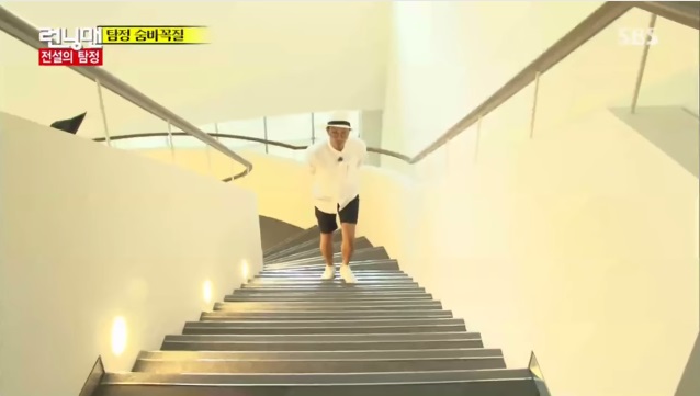 At the building, as Haha decides to move up one floor he does not forget to provide a tip to head to a floor that others cannot guess easily. And it must not be the topmost floor or basement, because that’s where most people will want to go first. He stresses that he’s pretty confident in running away as he’s been doing it for 5 years now. That’s when Jae Suk and co. arrives. Haha continues to relax until he spots Jae Suk’s VJ and starts running.