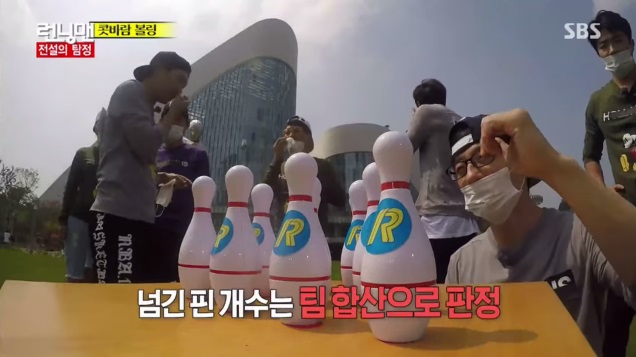 Jae Suk comes up with a witty ad-lib saying, “I hope your mucus comes out!” That causes Sang Woo to giggle and lose focus, so he ends up with zero pins. Gary comes along and literally blows his nose in front of the bowling pins; everyone bursts out laughing and in his defense he says he really caught a cold. Ji Hyo and Suk Jin are unable to get any pins down as well. The team with the least members blew the most pins down while the team with the most members got none. Haha the irony. So the teams depart in this order: Dong Il > Jae Suk > Sang Woo.