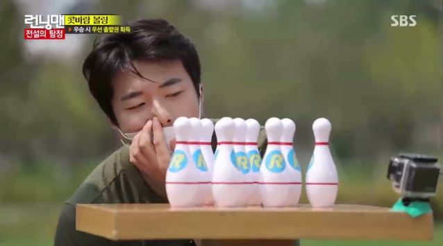 Now that the teams are decided, they have to play a first game to determine the order of leaving for the mission site. And that is: blowing through their noses to knock down plastic bowling pins. The team who topples the highest number of bowling pins will get to set off first. And the number is cumulative, so it’s advantageous if your team has more members. It’s hilarious because a commotion erupts when Kwangsoo takes his turn and knocks down almost all the pins. Everyone says it’s unfair and when he does it again, he only manages to hit one pin down. Sang Woo is the first to take up the challenge for his team; when he takes position and is so poised to hit the pins…