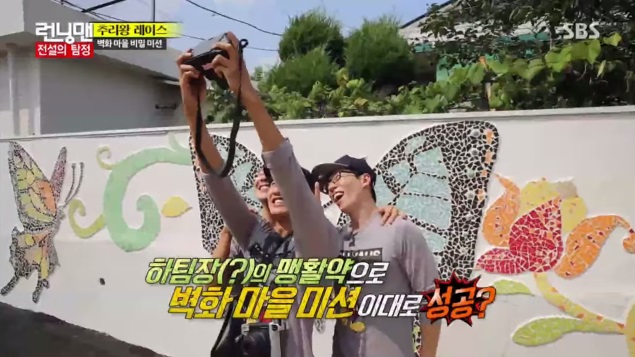 And then we see Haha and Kwangsoo excitedly get off the car with Jae Suk trailing behind, but there’s no food and they see a mural instead. Jae Suk welcomes them to the mural village HAHAHA; since they’re already here they embark on their mission. Nothing is found until Haha spots a mini ‘R’ sticker on one of the murals. Since they were given cameras, they deduce that they have to take a picture with the murals in the background. Haha and Kwangsoo do all the searching with Jae Suk just following them. Who’s the boss now XD They obtain their hint: a black baseball cap.