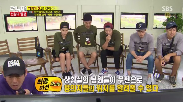 Meanwhile, the rest of the members are told to hide as detectives will be coming to look for them soon. Once their name tag is ripped off, they would be part of the detective’s team. We see Ji Hyo and Gary using boards to act as physical barriers to cover them, and Suk Jin asking where a good hiding place is. Prior to that, they are made aware that they may not necessarily be eliminated and Suk Jin worries that he’ll be left on the shelf hahaha~