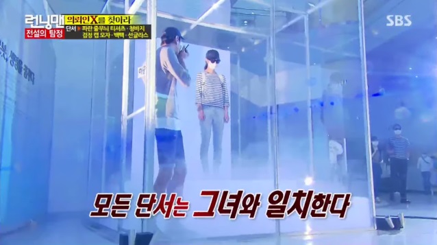 Ji Hyo sees a lady and guides her along to a camera to ask her team if she is the correct one. At the same time, Kwangsoo spots the same person and follows, because she seems to fit his group’s hint. As Ji Hyo’s team didn’t get the baseball cap hint, they say it’s not her and she lets her go. So Kwangsoo seizes this opportunity and takes her with him to the booth.